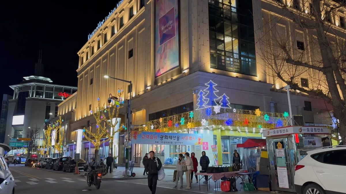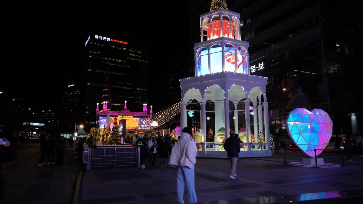Myeongdong is the most dynamic area to feel the Christmas spirit in Seoul. The spectacular media facades of the Shinsegae and Lotte department stores become landmarks every winter, and the streets are filled with warm lights and holiday decorations.